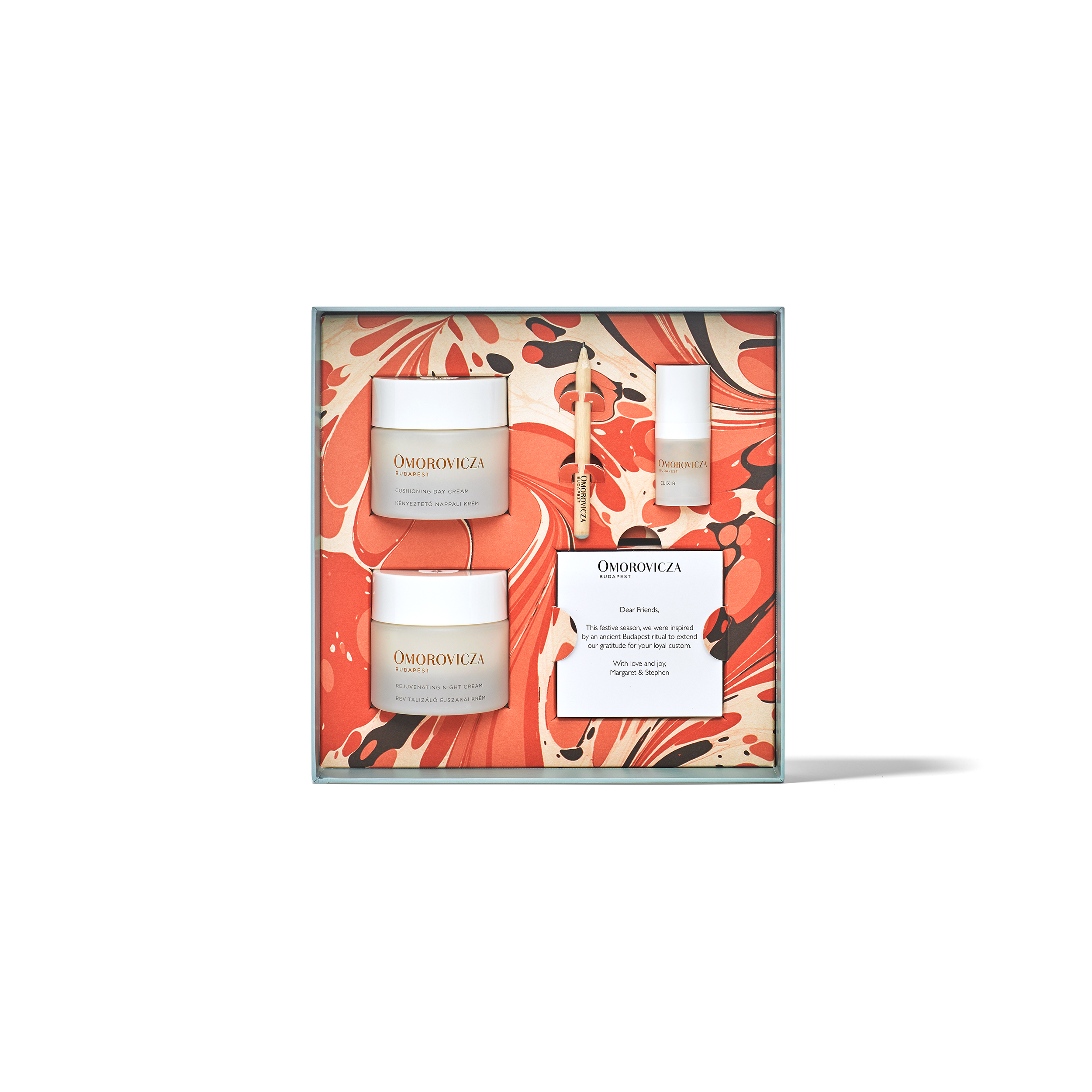 Elixir: Aqua (Water), Saccharomyces Ferment, Pentylene Glycol, Propanediol, Phospholipids, Maltodextrin, Phenoxyethanol, Glycerin, Leuconostoc/Radish Root Ferment Filtrate, Cucurbita Pepo (Pumpkin) Seed Extract, Carbomer, Sphingomonas Ferment Extract, Parfum (Fragrance), Tetrasodium Glutamate Diacetate, Sodium Hyaluronate, Salvia Officinalis (Sage) Leaf Extract, Ethylhexylglycerin, Citric Acid, Helianthus Annuus (Sunflower) Sprout Extract, Sodium Benzoate, Sodium Hydroxide, Potassium Sorbate, Citral, Geraniol, Limonene, Linalool. REJUVENATING NIGHT CREAM: AQUA (HUNGARIAN THERMAL WATER), GLYCERIN, BUTYROSPERMUM PARKII (SHEA BUTTER), SIMMONDSIA CHINENSIS (JOJOBA) SEED OIL, SQUALANE, CAPRYLIC/CAPRIC TRIGLYCERIDE, CETEARYL ETHYLHEXANOATE, PRUNUS DOMESTICA SEED EXTRACT, CETEARYL OLIVATE, STEARYL HEPTANOATE, SORBITAN OLIVATE, CETEARYL ALCOHOL, HYDROLYZED HAZELNUT PROTEIN, SACCHAROMYCES (HUNGARIAN THERMAL WATER) FERMENT EXTRACT, CERA ALBA (BEESWAX), PHENOXYETHANOL, MANNITOL, SODIUM LACTATE, MALPIGHIA PUNICIFOLIA (ACEROLA) FRUIT EXTRACT, PRUNUS ARMENIACA (APRICOT) KERNEL OIL, XANTHAN GUM, DISODIUM EDTA, PYRUS MALUS (APPLE) FRUIT EXTRACT, HELIANTHUS ANNUUS (SUNFLOWER) SEED OIL, TOCOPHEROL, ETHYLHEXYLGLYCERIN, PARFUM (FRAGRANCE), PHOSPHOLIPIDS, CHLORELLA VULGARIS/LUPINUS ALBUS PROTEIN FERMENT, PECTIN, YEAST EXTRACT, LINALOOL, GERANIOL, POTASSIUM SORBATE, BETA-CAROTENE, DAUCUS CAROTA SATIVA (CARROT) ROOT EXTRACT, DAUCUS CAROTA SATIVA (CARROT) SEED OIL, CINNAMYL ALCOHOL, ASCORBYL PALMITATE. CUSHIONING DAY CREAM: AQUA (WATER), COCO-CAPRYLATE/CAPRATE, GLYCERIN, SACCHAROMYCES (HUNGARIAN THERMAL WATER) FERMENT EXTRACT, DICAPRYLYL CARBONATE, C10-18 TRIGLYCERIDES, C12-16 ALCOHOLS, PRUNUS AMYGDALUS DULCIS (SWEET ALMOND) OIL, TRIHEPTANOIN, HELIANTHUS ANNUUS (SUNFLOWER) SEED OIL, STEARYL HEPTANOATE, BENTONITE, GLYCERYL STEARATE CITRATE, PALMITIC ACID, SODIUM LEVULINATE, SODIUM STEAROYL GLUTAMATE, HYDROGENATED LECITHIN, CETYL ALCOHOL, XANTHAN GUM, C9-12 ALKANE, STEARYL CAPRYLATE, DILINOLEIC ACID/BUTANEDIOL COPOLYMER, PHOSPHOLIPIDS, JOJOBA ESTERS, ETHYLHEXYLGLYCERIN, PARFUM (FRAGRANCE), SODIUM ANISATE, HELIANTHUS ANNUUS (SUNFLOWER) SEED WAX, SORBITAN CAPRYLATE, LEUCONOSTOC/RADISH ROOT FERMENT FILTRATE, TOCOPHEROL, PHYTIC ACID, PLANKTON EXTRACT, ACACIA DECURRENS FLOWER WAX, POLYGLYCERIN-3, CASTOR OIL/IPDI COPOLYMER, ALTEROMONAS FERMENT EXTRACT, PHENETHYL ALCOHOL, CISTUS INCANUS FLOWER/LEAF/STEM EXTRACT, PHENYLPROPANOL, 1,2-HEXANEDIOL, LINALOOL, BENZYL SALICYLATE, CITRONELLOL, LIMONENE, GERANIOL