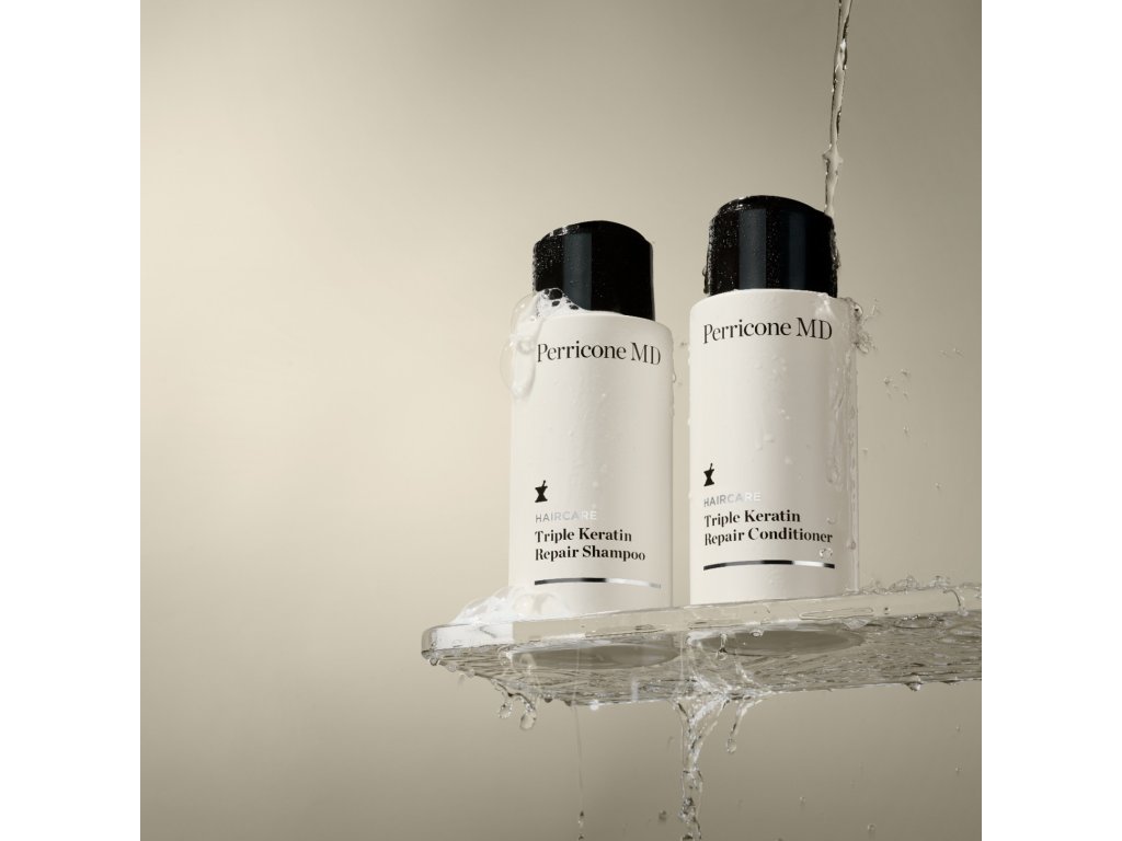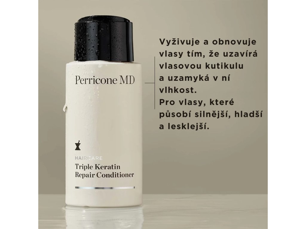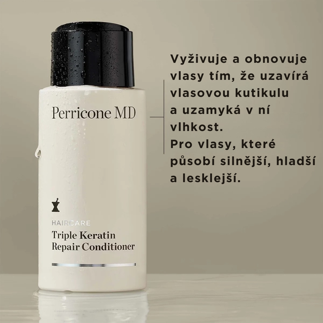Luxusní obnovující kondicionér Perricone MD Haircare Triple Keratin Repair Conditioner je vyhlazující péče pro suché, chemicky namáhané a oslabené vlasy se sklonem k lámání. Okamžitě zjemňuje povrch vlasu, pomáhá zacelit a uhladit vlasovou kutikulu a výrazně ulehčuje rozčesávání. Tím snižuje tření při česání, pomáhá omezit lámavost, krepatění a další mechanické poškození. Po použití jsou vlasy hebčí, poddajnější, lesklejší a snadněji upravitelné – bez pocitu těžkých vlasů.