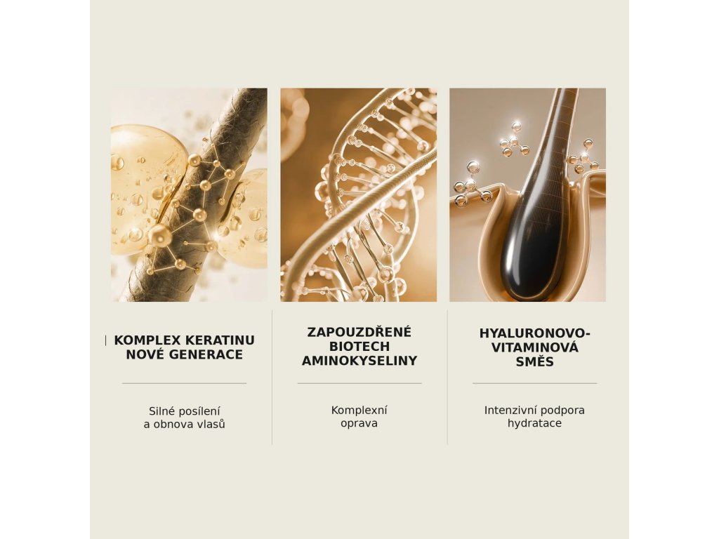 - Směs tří typů keratinu pro posílení a obnovu vlasového vlákna