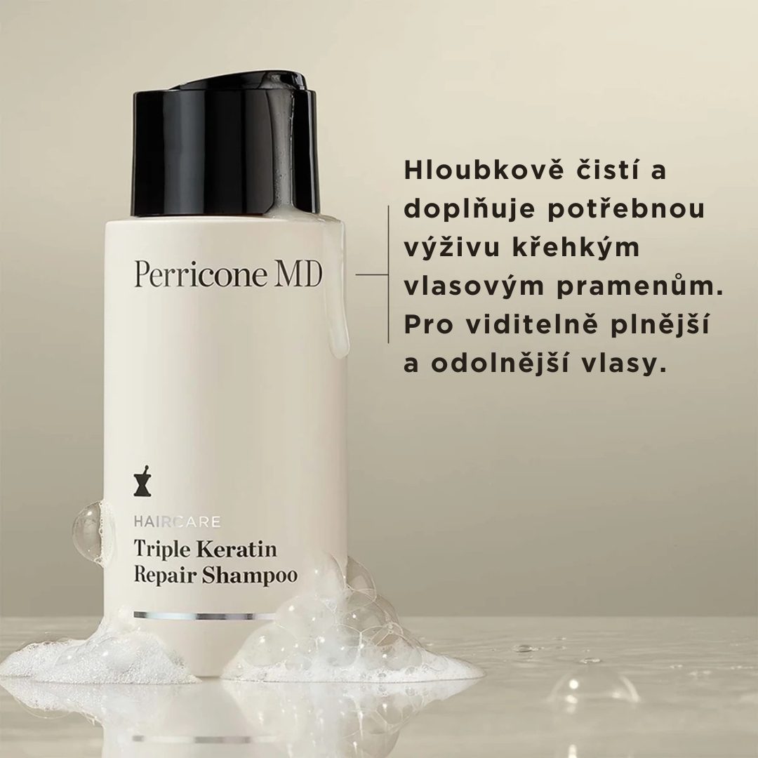 Prémiový posilující šampon Perricone MD Haircare Triple Keratin Repair Shampoo je vědecky navržená péče pro oslabené, namáhané a lámavé vlasy. Šetrně, ale efektivně smývá nečistoty z pokožky hlavy i délek, pomáhá zpevnit vlasové vlákno a postupně vrací vlasům hladší, upravenější a zdravě vypadající vzhled bez zbytečného zatížení. Hodí se pro vlasy namáhané barvením, tepelným stylingem, chemickými úpravami i běžným každodenním namáháním.